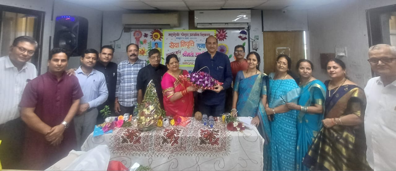 मुंबई। महादेवी पोद्दार प्राथमिक विद्यालय की मुख्याध्यापिका उषा त्रिपाठी की सेवानिवृत्ति के अवसर पर आज विदाई समारोह का आयोजन किया गया। कार्यक्रम में प्रमुख अतिथि के रूप में उपस्थित बीएमसी स्कूलों के पूर्व शिक्षण अधिकारी अशोक मिश्र ने कहा कि श्रीमती त्रिपाठी अपने कर्तव्यों के प्रति पूरी तरह से समर्पित रहीं। इस अवसर पर पत्रकार गुलाबधर पांडे, दिनेश द्विवेदी,मंजुला त्रिपाठी, पुष्पा द्विवेदी, शशितारा सिंह, रंजना शिर्के, रेखा सिंह, गणेश सिंह, रूद्रप्रकाश मिश्रा, सरिता तिवारी, प्रमोद त्रिपाठी, पूजा मिश्रा, शैलेंद्र कुमार सिंह, सुहास मिरकुटे समेत अनेक गणमान्य लोग उपस्थित रहे।