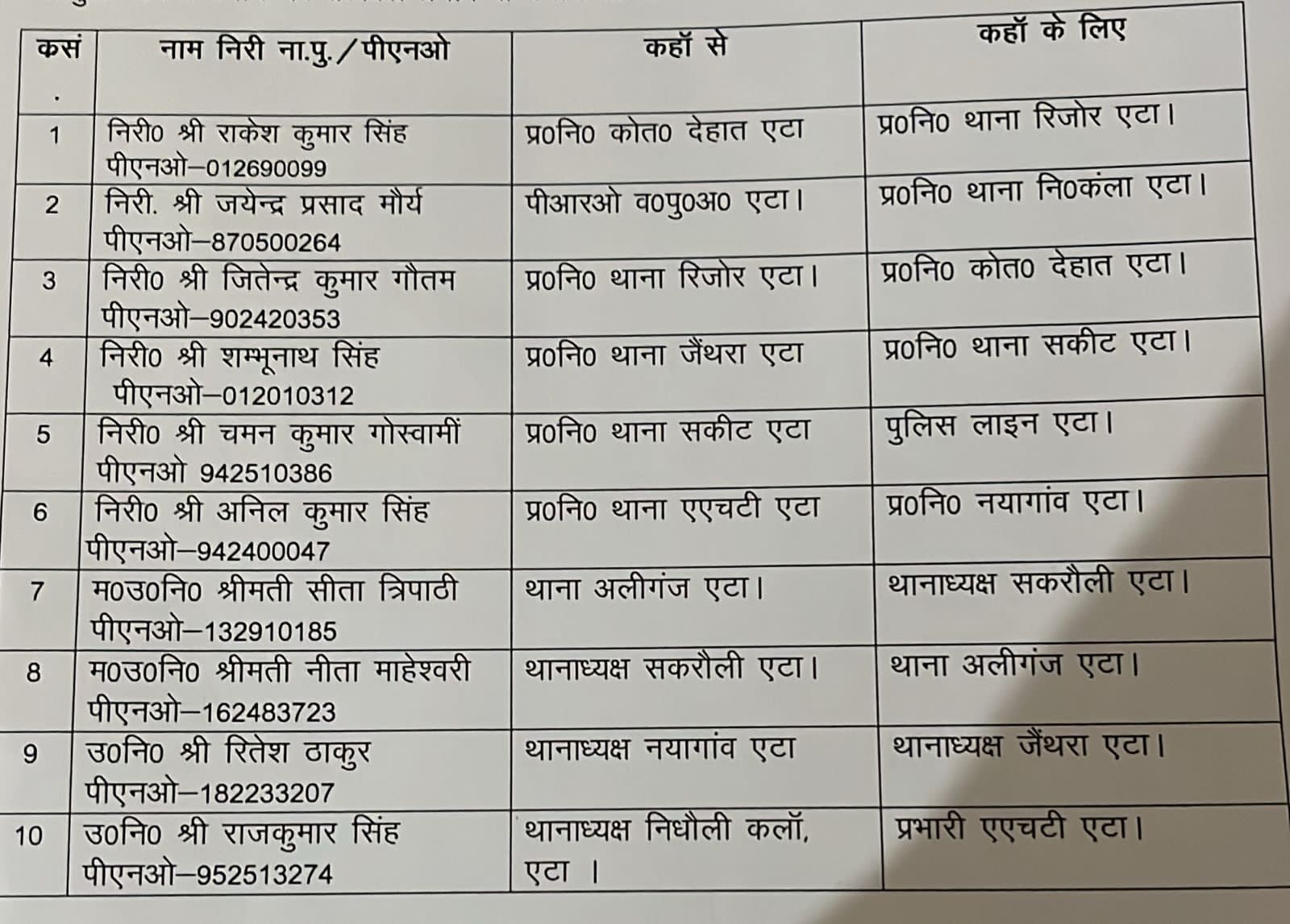 एटा, 6 अगस्त उत्तर प्रदेश के एटा जनपद में बीते तीन दिनों के भीतर पुलिस महकमे में बड़ा प्रशासनिक फेरबदल हुआ है। जिले के वरिष्ठ पुलिस अधीक्षक श्याम नारायण सिंह ने 12 थानों के प्रभारी निरीक्षकों और थानाध्यक्षों का तबादला कर ताश के पत्तों की तरह फेंटकर इधर से उधर कर दिया है। इनमें सिर्फ तीन इंस्पैक्टर को नई तैनाती मिली है, जबकि एक को पुलिस लाइन भेजा गया है।