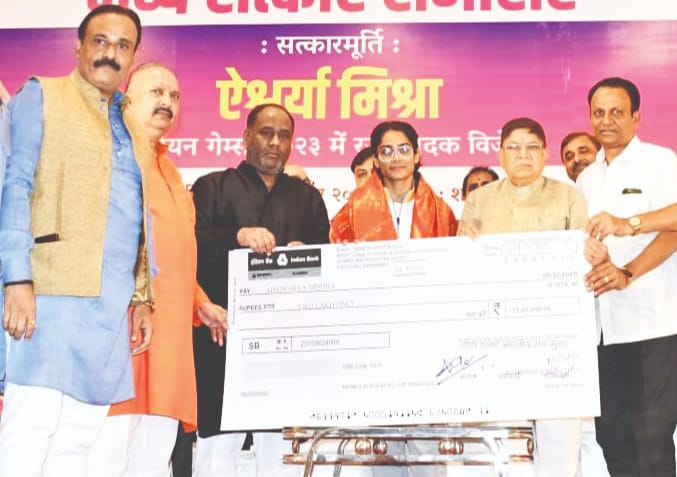 मुंबई। एशियाई खेलों में 4 गुणे 400 मीटर रिले स्पर्धा में रजत पदक जीतकर देश और उत्तर भारतीय समाज का नाम रोशन करने वाली ऐश्वर्या मिश्रा का रविवार को उत्तर भारतीय संघ की तरफ से बांद्रा पूर्व स्थित संघ भवन में आयोजित एक भव्य समारोह सत्कार किया गया। उत्तर भारतीय संघ के अध्यक्ष संतोष आरएन सिंह ने दो लाख रुपए का चेक, शाल और श्रीफल देकर उन्हें सम्मानित किया। सम्मान समारोह में उत्तर भारतीय समाज की तरफ से ऐश्‍वर्या मिश्रा को ओलंपिक गेम्स में गोल्ड मेडल जीतकर लाने का आशीर्वाद दिया गया। इस अवसर पर ऐश्‍वर्या मिश्रा के पिता कैलाश नाथ मिश्रा और माता आशा मिश्रा का भी सम्मान किया गया।
