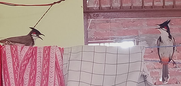 भीषण गर्मी से जहां पानी की कमी के चलते पशु पक्षी आबादी की ओर रुख कर रहे हैं। सोमवार को ये दोनों बुलबुल भीषण गर्मी के चलते छाया में भी चोच बाये हांफती नजर आ रही हैं।पक्षियों के साथ एक समस्या यह भी देखने को मिलती है कि उन्हें भीषण गर्मी के चलते भोजन की कमी की भी समस्या का सामना करना पड़ रहा है। चूंकि इस समय खेत और खलिहान में किसी फसल की मड़ाई चल नहीं रही है जिस कारण उन्हें अनाज बिखरे नहीं मिलते हैं। दूसरी समस्या यह है कि इस समय गर्मी के चलते जमीन में नमी बहुत कम हो गई है। चूंकि नमी वाली जमीन में ही कीड़े मकोड़े फलते फूलते हैं । जमीन में नमी न होने के कारण इनकी संख्या भी बहुत घट गई है। ऐसे में हमें घरों के आस-पास तथा छायादार स्थानों पर पक्षियों के लिए पानी तो रखना ही चाहिए साथ -साथ अनाज भी बिखेर देने चाहिए क्योंकि परिंदे प्यास के साथ- साथ भूख से भी व्याकुल चल रहें हैं।