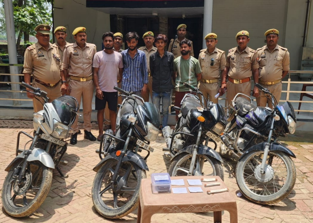 थाना सिंगरामऊ व स्वाट की संयुक्त पुलिस टीम के द्वारा मुखबिर खास की सूचना पर ग्राम मल्लूपुर नहर पटरी के पास से चार लोगों को चोरी की 4 मोटर साइकिल के साथ गिरफ्तार किया गया। जमातलाशी से 3 नाजायज चाकू व 4 मोबाइल फोन बरामद हुआ। गिरफ्तारी बरामदगी के सम्बन्ध में थाना सिंगरामऊ पर मु0अ0सं0-94/2025 धारा-2(30), 317(2), 317(4), 317(5) बीएनएस व 4/25 आर्म्स एक्ट पंजीकृत कर आवश्यक विधिक कार्यवाही की जा रही है।