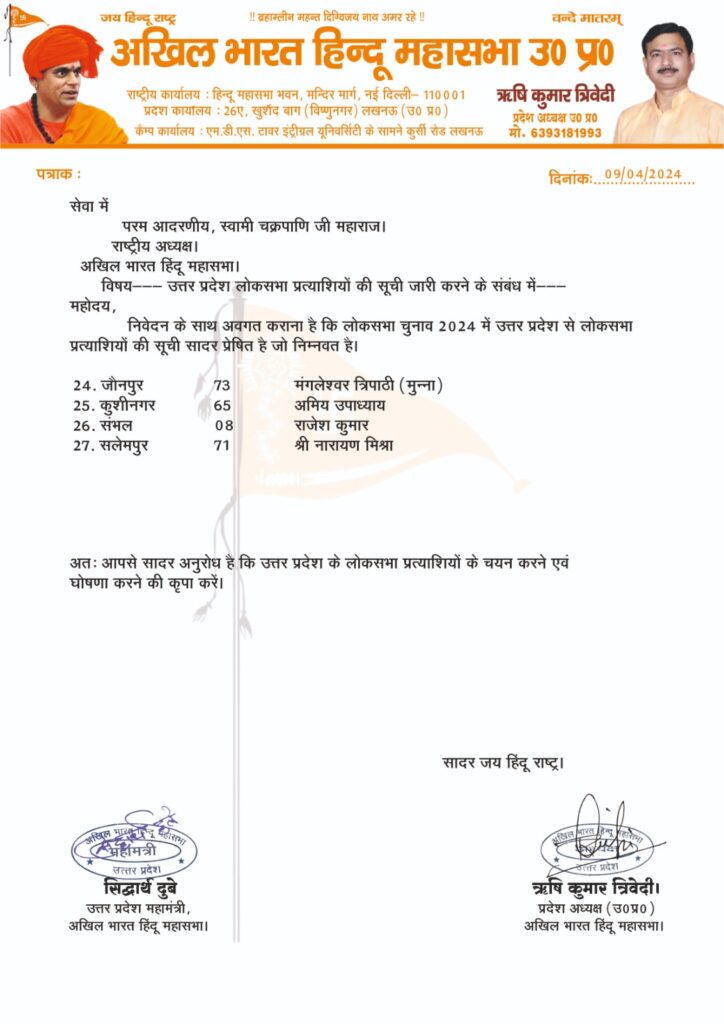 जौनपुर। अखिल भारतीय हिंदू महासभा, उत्तर प्रदेश द्वारा 73 ,जौनपुर लोकसभा सीट से वरिष्ठ पत्रकार एवं समाजसेवी मंगलेश्वर त्रिपाठी उर्फ मुन्ना त्रिपाठी का नाम टिकट के लिए प्रस्तावित किया गया है। देश की सबसे पुरानी हिंदुवादी पार्टी कही जानें वाली हिन्दू महासभा के प्रदेश अध्यक्ष ऋषि कुमार त्रिवेदी द्वारा राष्ट्रीय अध्यक्ष स्वामी चक्रपाणि को भेजे गए पत्र में जौनपुर से मुन्ना त्रिपाठी के नाम पर मुहर लगाने का अनुरोध किया गया है। मुन्ना त्रिपाठी के जौनपुर से प्रत्याशी घोषित किए जानें पर लोगों में जोरदार चर्चा सुरु हो गई है। 44 वर्षीय त्रिपाठी का 25 वर्ष का राजनैतिक अनुभव है शरद पवार की राष्ट्रवादी कांग्रेस के संस्थापक सदस्य हैं एनसीपी में तालुका अध्यक्ष जिला अध्यक्ष राष्ट्रीय महासचिव युवक के रुप में कार्य कर चुके हैं। मुंबई में उत्तर भारतीयों में बेहद चर्चित रहने वाले मुन्ना त्रिपाठी शिवसेना प्रमुख बाल ठाकरे राज ठाकरे से कई बार सीधी टक्कर ले चुके हैं, जिसके चलते राज ठाकरे को जेल भी काटनी पड़ी और बाल ठाकरे की भी गिरफ़्तारी हुई थी। मुन्ना त्रिपाठी समाजवादी पार्टी के महाराष्ट्र में प्रदेश महासचिव भी रह चुके हैं और 2011 में कांग्रेस से जुड कर यूपी कांग्रेस में महासचिव जनांदोलन प्रभारी के साथ कांग्रेस ब्रिगेड के राष्ट्रीय अध्यक्ष भी रह चुके हैं। मुन्ना त्रिपाठी राजनेता के साथ साथ वरिष्ठ पत्रकार लेखक और स्तंभकार भी है। इस बारे में पूछे जाने पर मुन्ना त्रिपाठी ने कहा कि यदि अखिल भारतीय हिंदू महासभा ने उन्हें मौका दिया तो वह चुनाव जरूर लड़ेंगे।