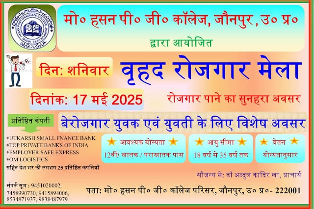 जौनपुर : जनपद जौनपुर के शैक्षिक इतिहास में एक ऐतिहासिक पहल करते हुए मोहम्मद हसन पी. जी. कॉलेज पहली बार वृहद स्तर पर रोजगार मेले का आयोजन कर रहा है। यह मेला 17 मई 2025 को कॉलेज परिसर में आयोजित किया जाएगा, जिसका उद्देश्य जिले के अधिक से अधिक युवाओं को रोजगार के अवसर उपलब्ध कराना है।