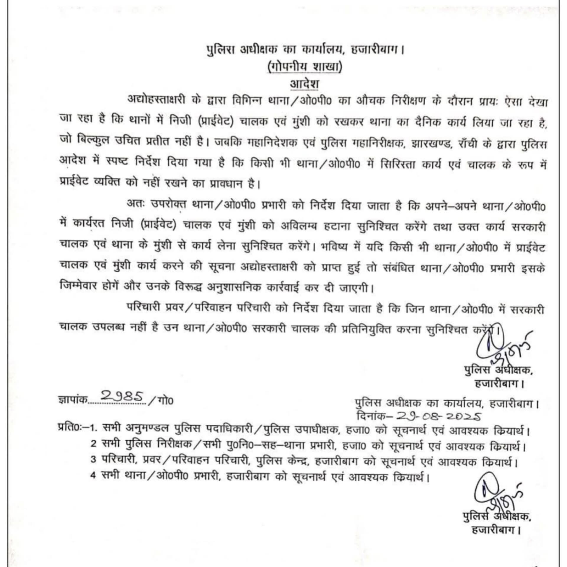 *झारखंड के थानों में प्राइवेट ड्राइवर और मुंशी पर लगेगा ब्रेक, डीजीपी के आदेश के बाद एसपी ने जारी किया निर्देश*